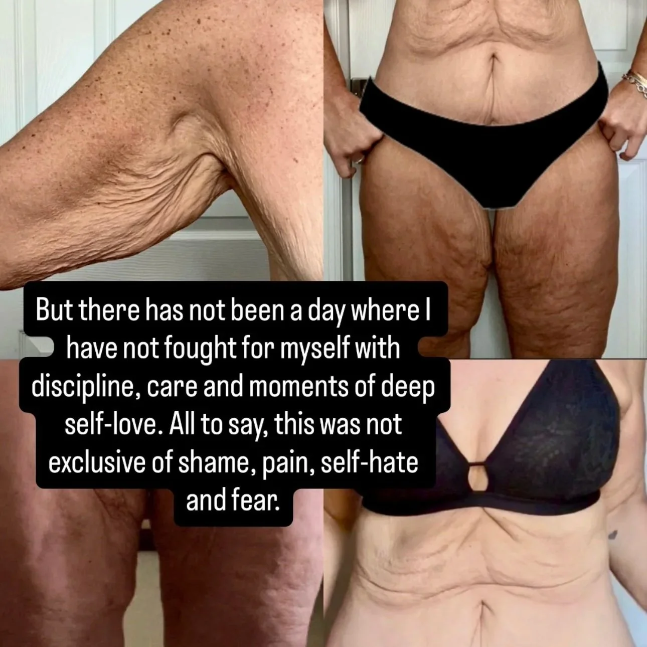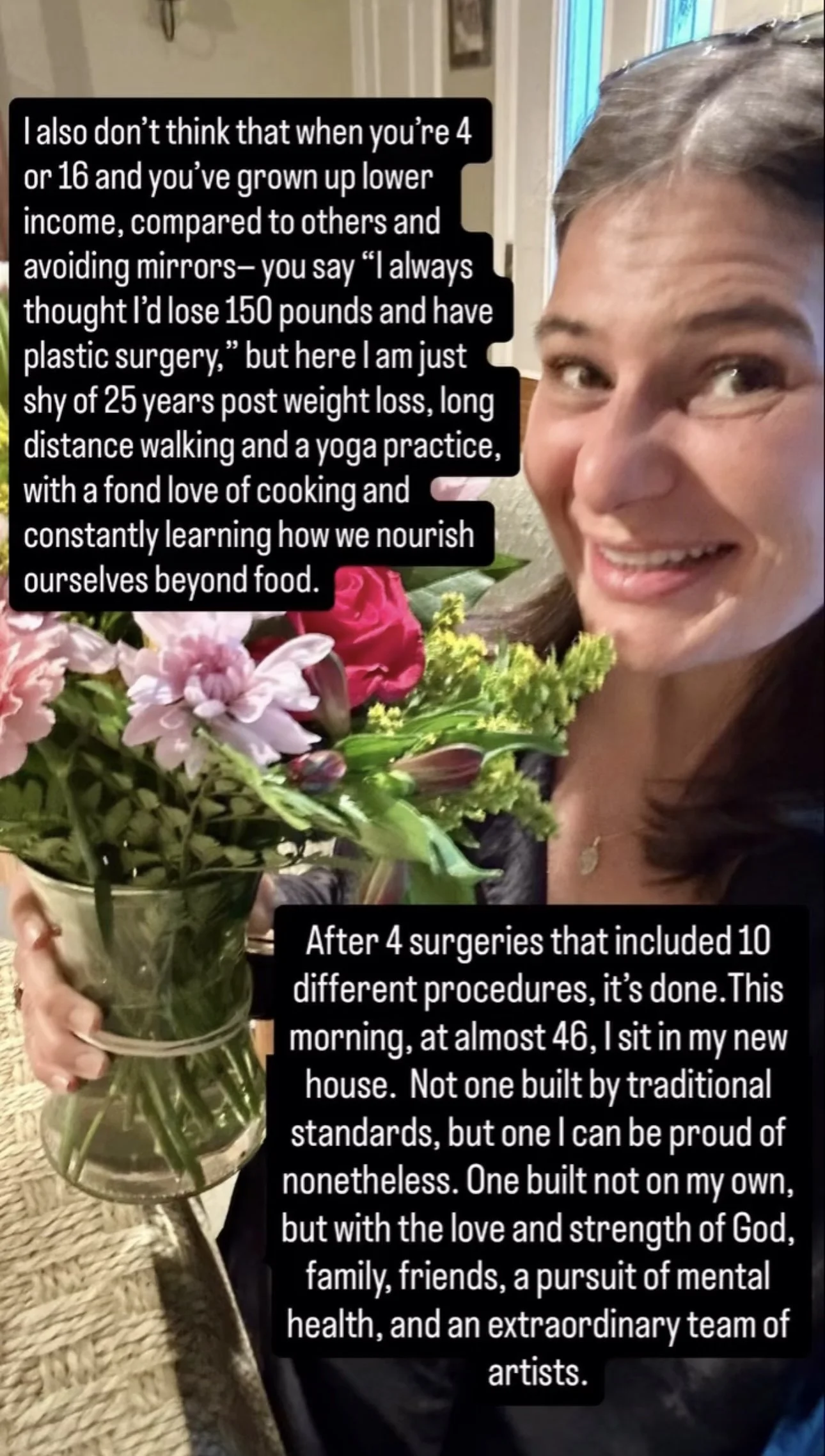 Over 24 years ago I lost over 150 pounds on my own— long before social media existed. Before high speed internet and well before I had my own computer— let alone a cellphone to document the process. But this is a journey, however, that I’ve been open about sharing. In the last 24 years I cooked my heart out, exercised, and changed my mental and emotional health. Over time, I settled into my body and extra skin or, rather, it settled on me. And while I held on to past wounds, the words I was told about my weight and worthiness, I did come to admire the loose skin for its symbolism — the effort it took to get here. And while that’s the truth, the other side of the truth is that looking at the skin, every single day, has also felt like staring into my darkest parts— carrying them and allowing them to live not only on my body but, eternally giving them residence in my mind.
