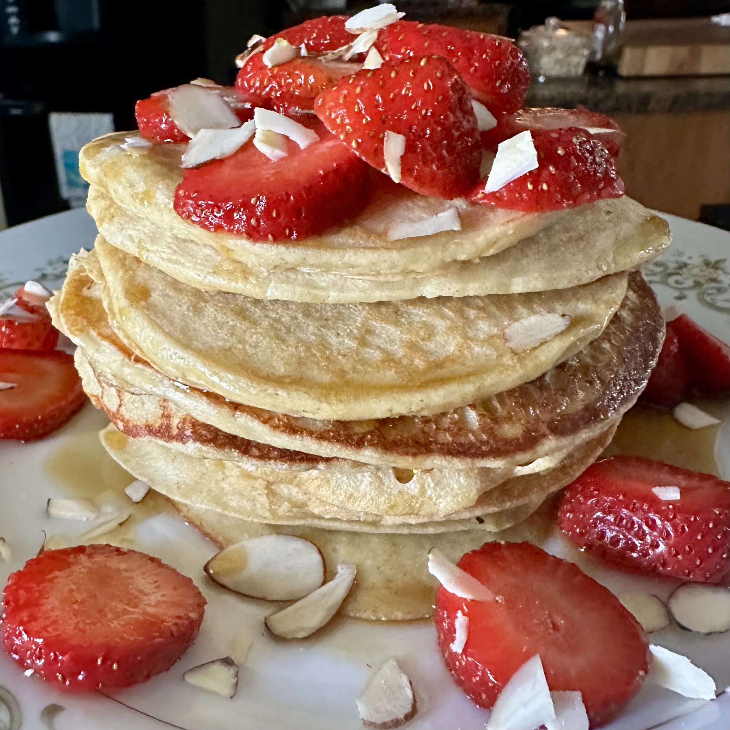 When he’s given pancakes I like to stack them high and put fruit on top, which works for satiety and eating with the eyes. My father always loved food and a pretty plate, but now I find it matters to appeal to his senses even more because he’s like a child and some days it takes a lot of convincing to have him do certain things. These pancakes didn’t take any convincing, really, the smell of lemon and strawberries was so fragrant. Stacked high and covered with almonds, a touch of a styrup and a pat of butter, he thought he was in heaven. I want my father’s days, parts of them and the ones I have the gift of being a part of, to feel like a trip to heaven, especially when I know most of the days in his mind are not.