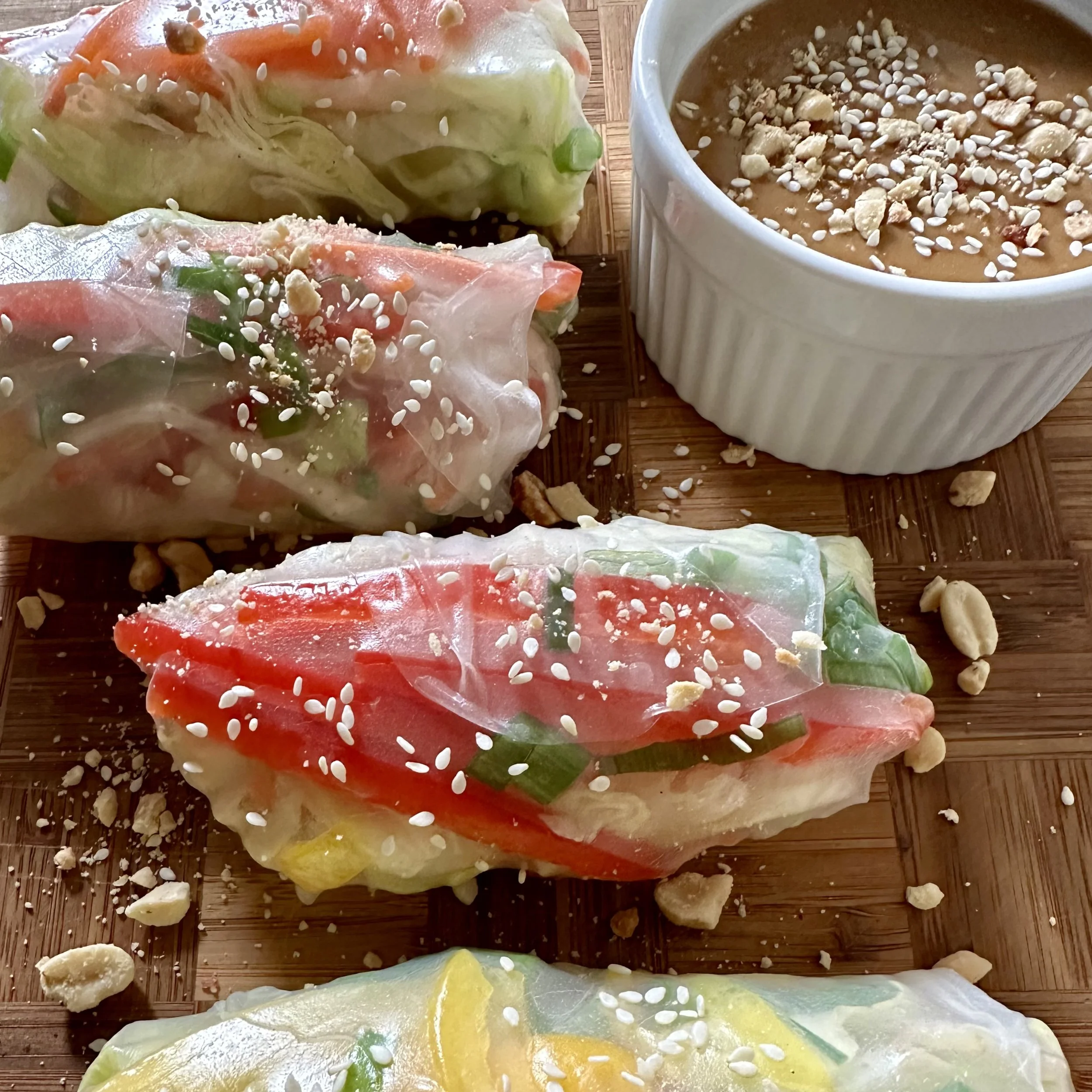 Fast forward to 2025 as I’m summer living with my parents and trying to think of new meals to make every night of the week (you know, along with the rap sheet of standard meals that get cycled in on repeat). It’s been hot and the theme here is light and healthy with mom’s surgery recovery, Tommy’s inflammation and dad’s dementia. I try to keep meals, balanced, FUN, colorful, veggie forward, filled with healthy fats, carbs and TASTINESS. So, I pulled out my 2003 taste memory and recreated summer rolls, but instead of bathing them in a gelatinous sweet and sour sauce (that no doubt was laden with high fructose corn syrup), I whipped up a spicy and sweet peanut sauce to hit the healthy fat marker and to help with satiety for such a light meal.