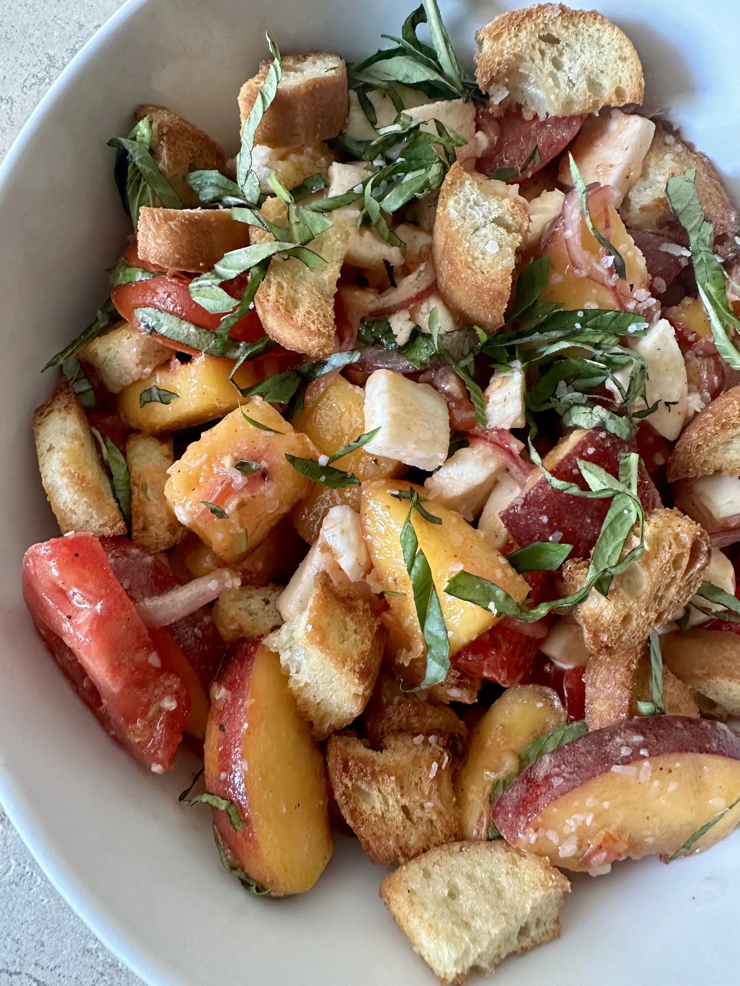 —Add the strained peaches and tomatoes to a large bowl, along with the toasted bread, onions, mozzarella and basil