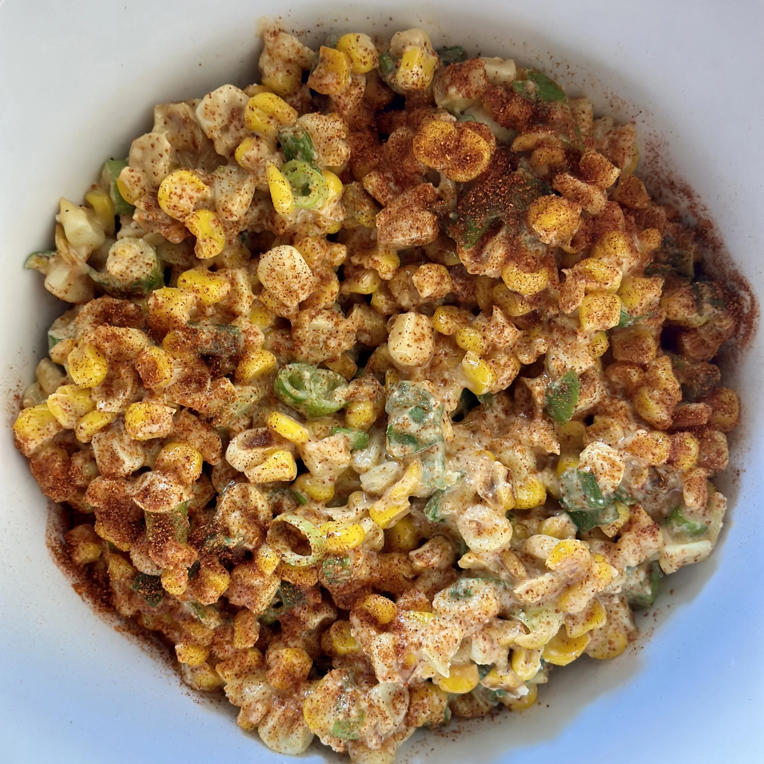 Instead of placing the corn kernels in a tomato based broth, I cooked them off in a mix of butter and extra virgin olive oil with garlic and scallions to prep them with some flavor — adding a healthy sprinkle of salt — until they were golden brown. At this point, I let them cool and turned to making the corn salad dressing using a mix of mayonaise and a touch of Greek yogurt, chili powder, a sprinkle of cumin, smoked paprika and the juice of 1 lime. Along with cilantro, extra scallions and cotija cheese — you’ll have the makings for a very fresh and simple Mexican corn salad.