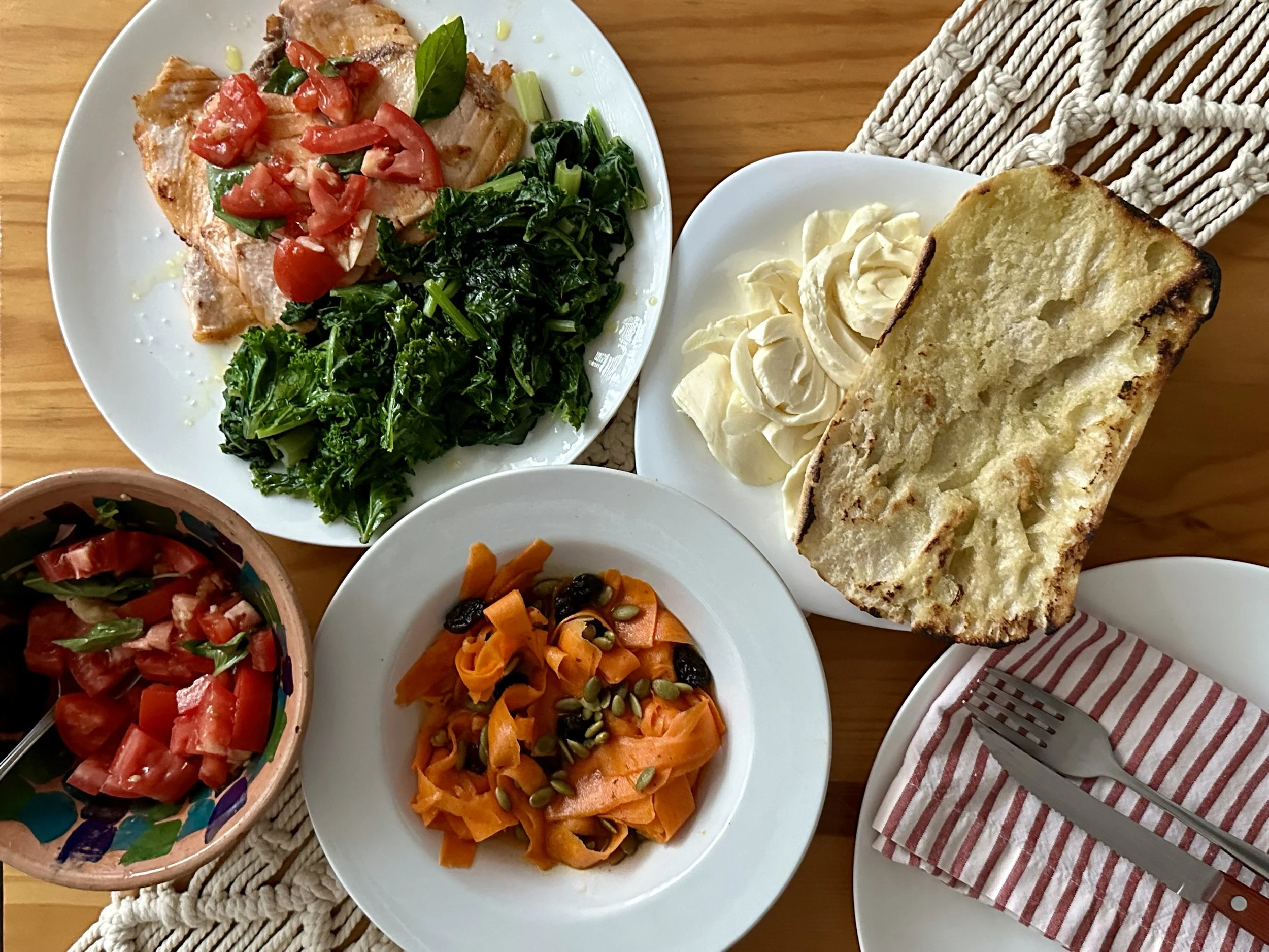 I prepared a mix of kale and swiss chard with onions and garlic in olive oil, alongside a series of salads. An Italian tomato salad and a spicy carrot salad - to be exact. The salmon was simply seared in a pan with salt and lime; then dressed with all of the flavors that mingled in each of the vegetables bowls.