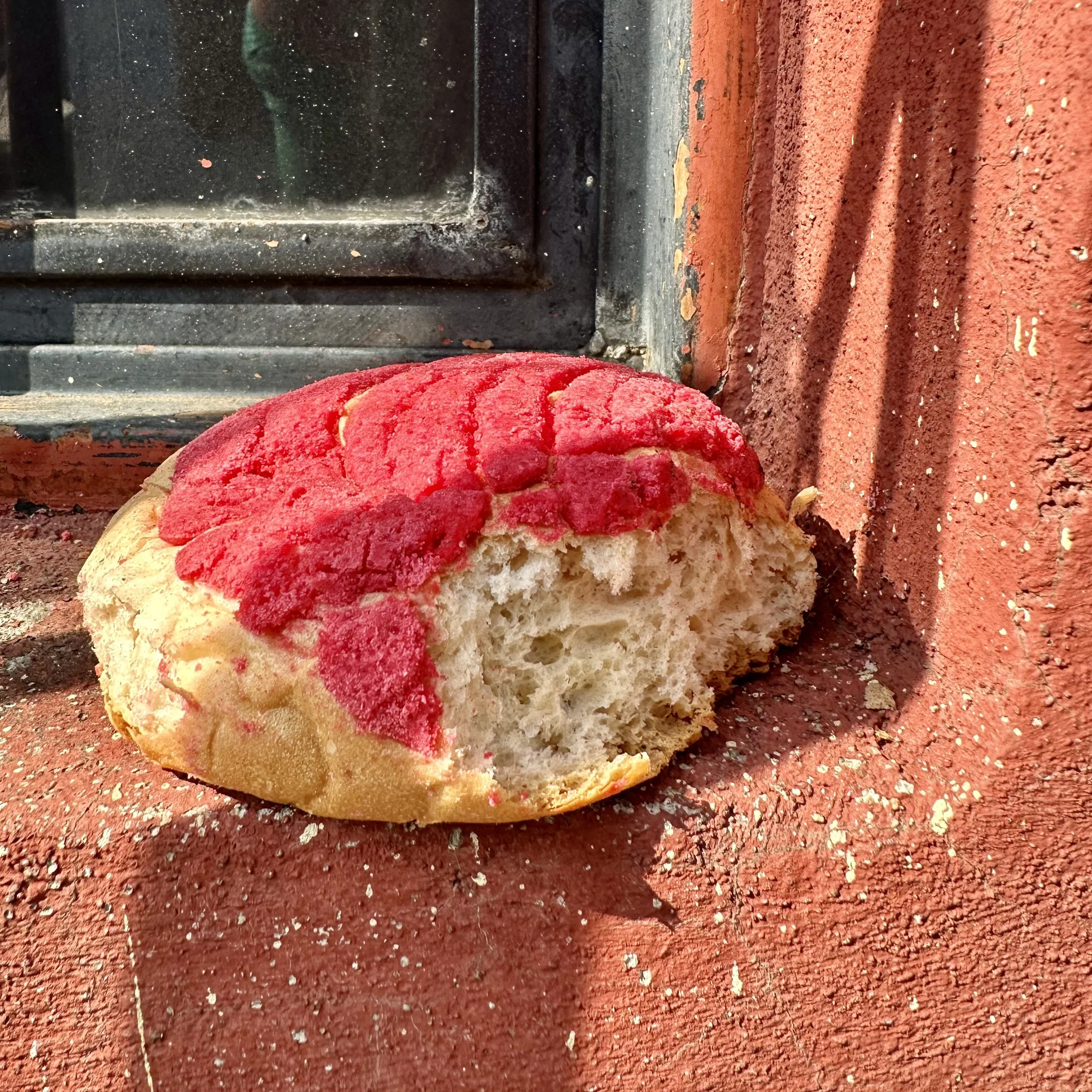 Who would abandon a concha, I don’t know? It could only be for the sake of art; or she was left on her own after a man was drinking all night and he decided “You’re not the one for me, concha, I’m leaving you here.” I felt the pain of that concha. I imagined she drank too much, went home with a man as his second choice and, he said “Concha, I’ll walk you out now, you have to leave.” She took the closest seat she could find and there she rested in thought - with her red sugar coated off the shoulder top, devoured and abandoned by one night of passion. Poor concha, you were so beautiful with your bright red confidence. Now, you’re alone.