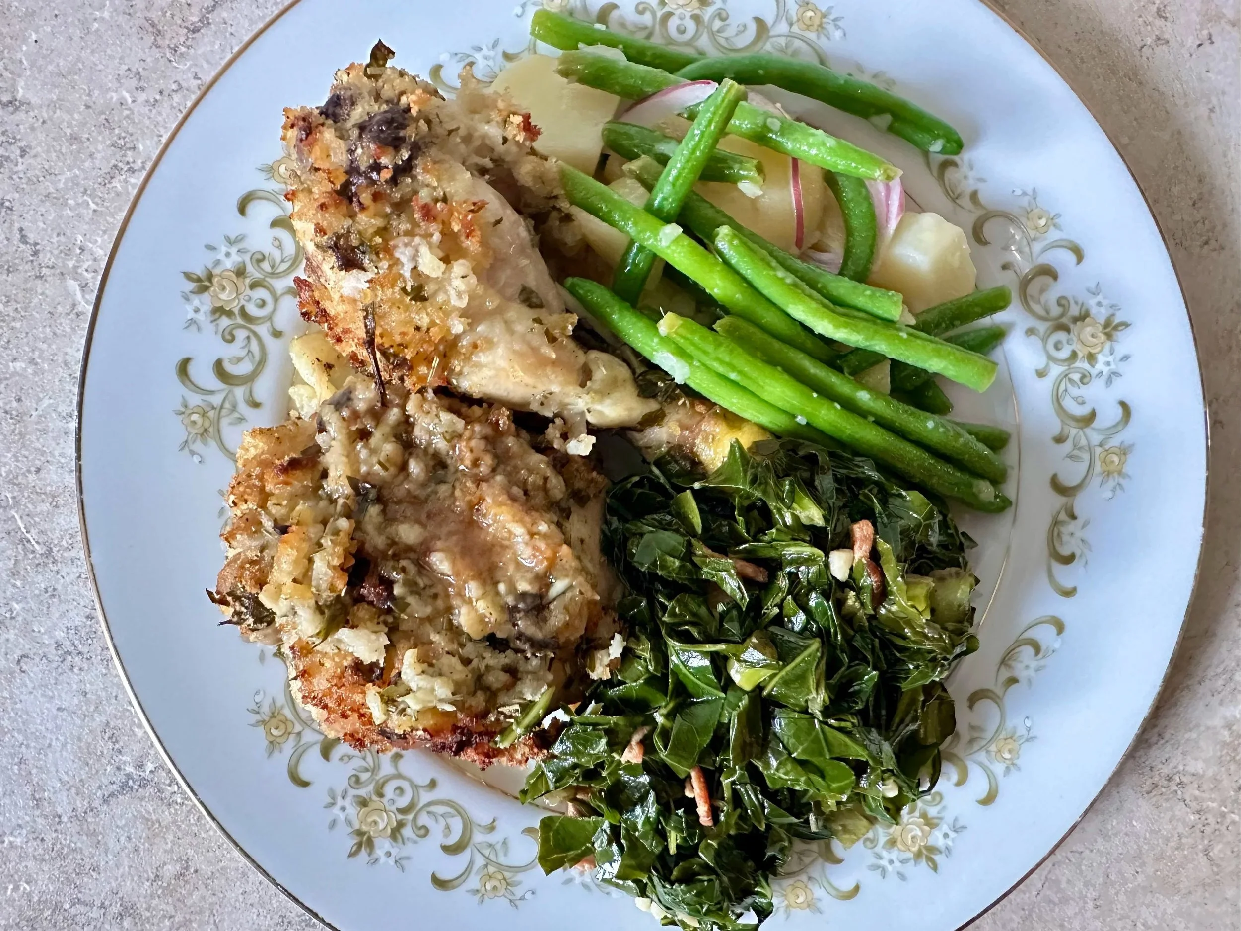 While I prepared this plate a few months ago (ok, fine, September of 2025), I haven’t gotten around to writing the recipe. Between surgeries, a lack of mobility and maybe a dash of motivational missteps and mild circumstantial depression — writing and cooking have been put on the back burner,— no pun intended. But my best friend is trapped in an unwieldy North Carolina snowstorm that will have her homebound with chicken legs and thighs, so here we are. Since she asked for the recipe this morning, I figured it’s high time to get this meal out of my mind and the time space continuum and onto a page. An homage to to my grandma and my best friend who, coincidentally, share the same exact birthday. Thank you, both, for the motivation. Finally.